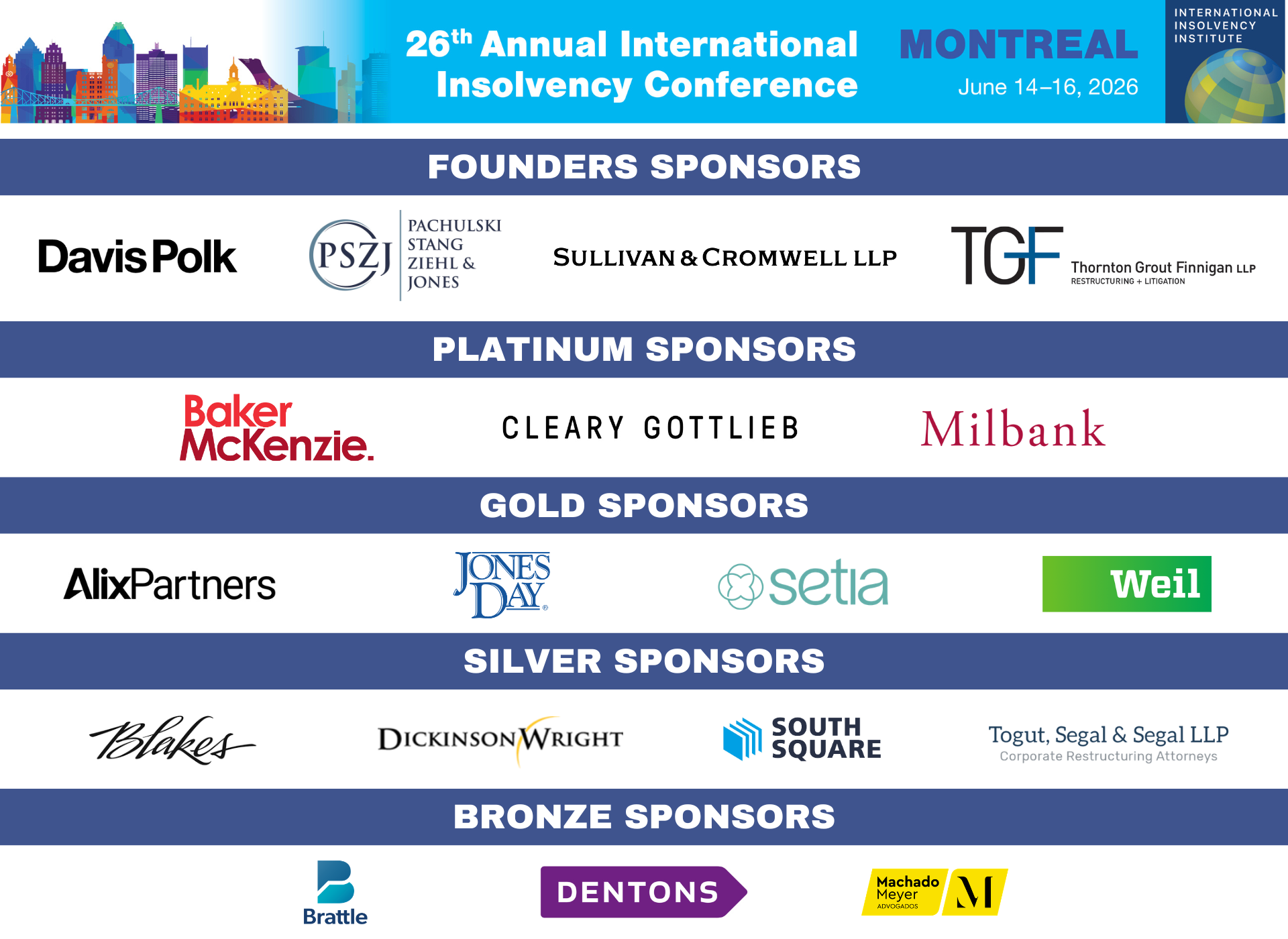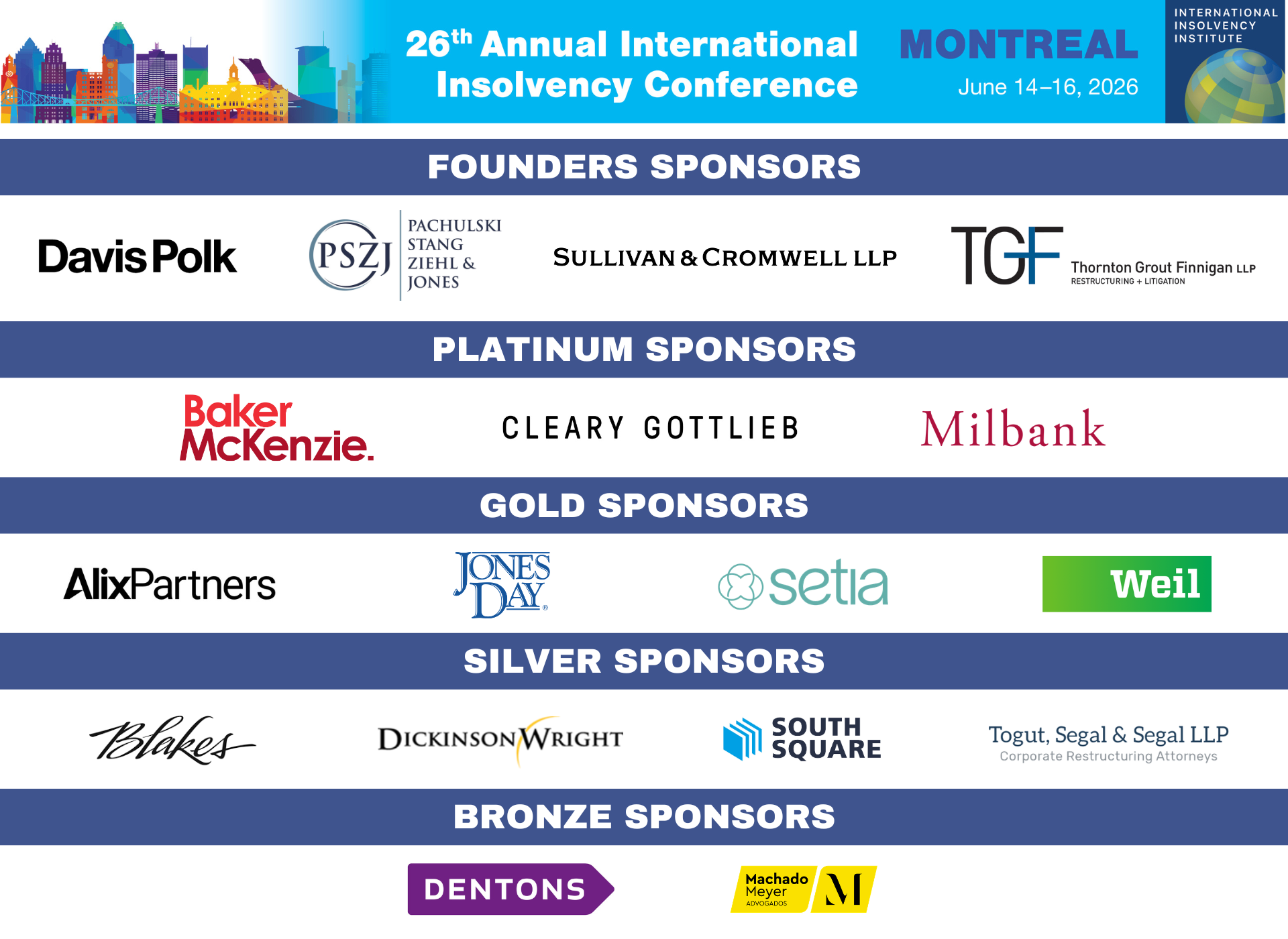 III's Annual Conferences are always the "can't miss" educational and networking highlight of the year in the international insolvency space. The support of our valued sponsors enables III to provide not only the best programming but also supports the goals of having judges, academics, and other thought leaders at the conference. If you would like to see your firm on the list below, please visit the link below with details of the various sponsorship opportunities available.